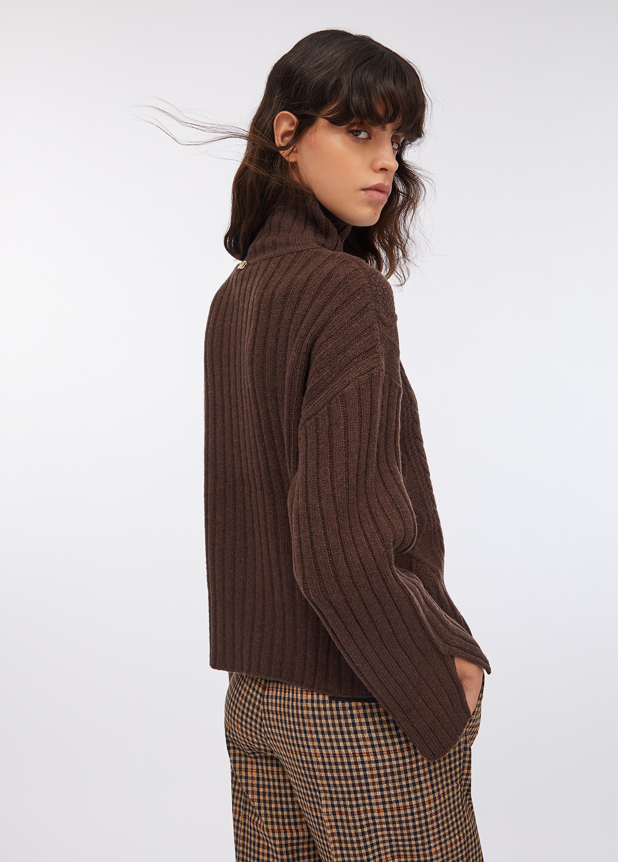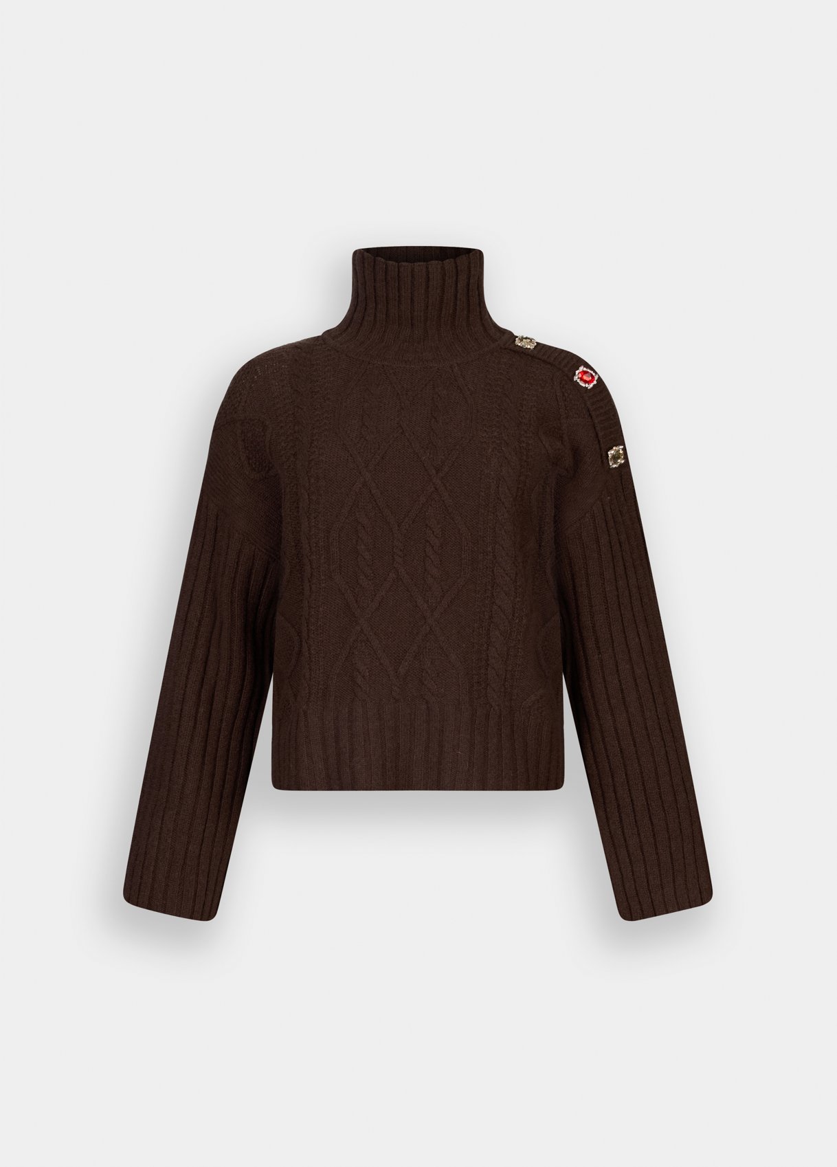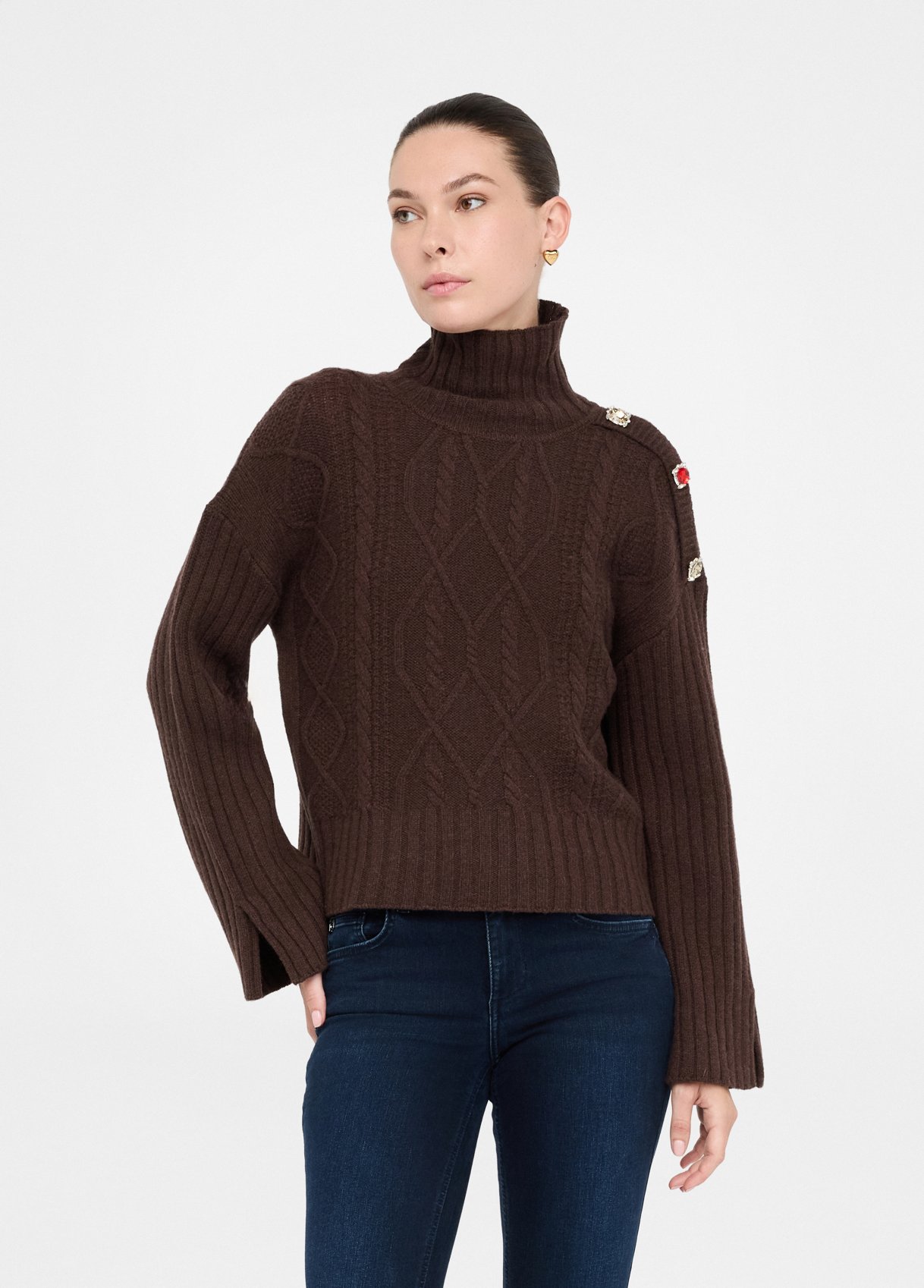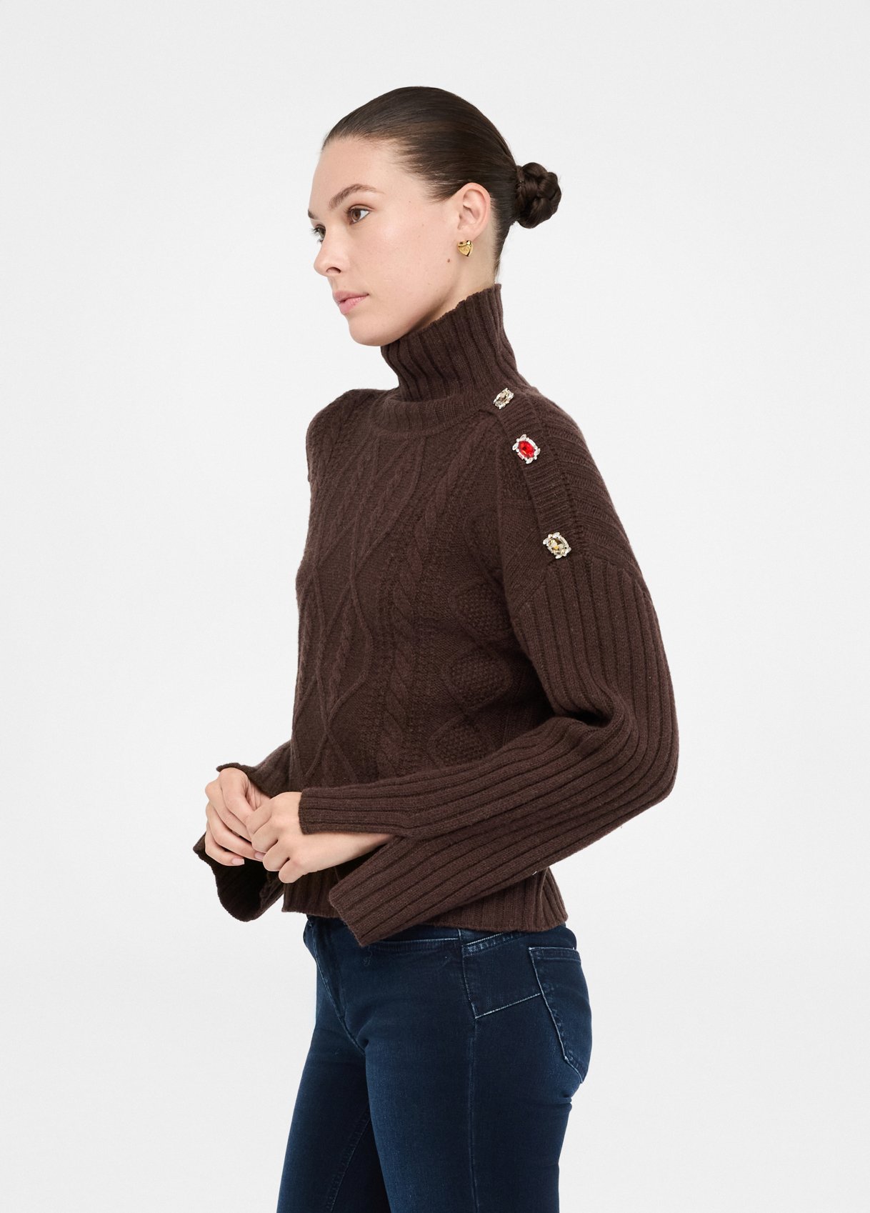 Fit: Relaxed fit, turtleneck, cable knit, jewel shoulder buttons