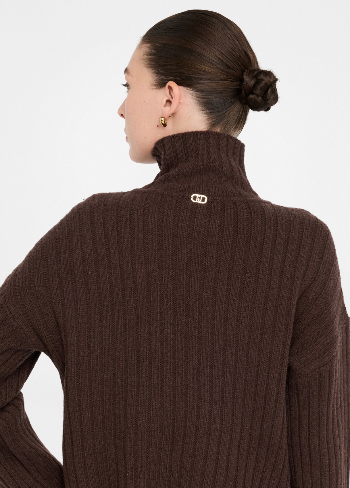 Corte: Gola alta, tricot torcido, botões joia no ombro