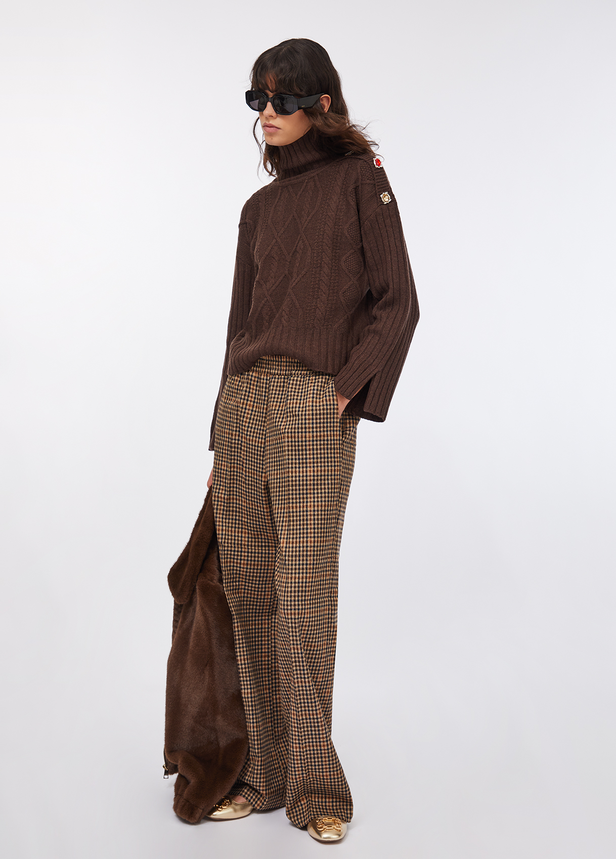 From the Evening Knitwear line, this Liu Jo turtleneck embodies quiet luxury through refined texture and jewel detailing. Made from soft wool yarns, it features a cable-stitch weave and gem-embellished buttons on the shoulder for a sophisticated touch. The high neck and relaxed silhouette combine warmth with understated glamour — perfect for the new season’s elegant minimalism.