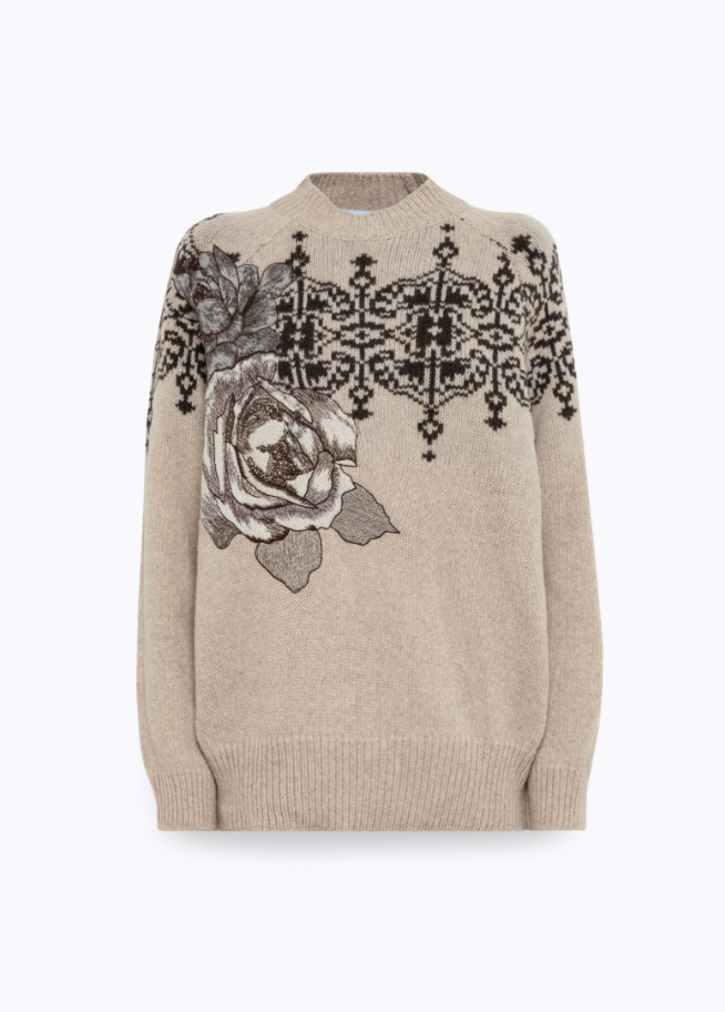 Camisola em lã 100% natural com aplicação jacquard em filigrana rendada e delicado bordado em fio que desenha uma rosa sobre o ombro.